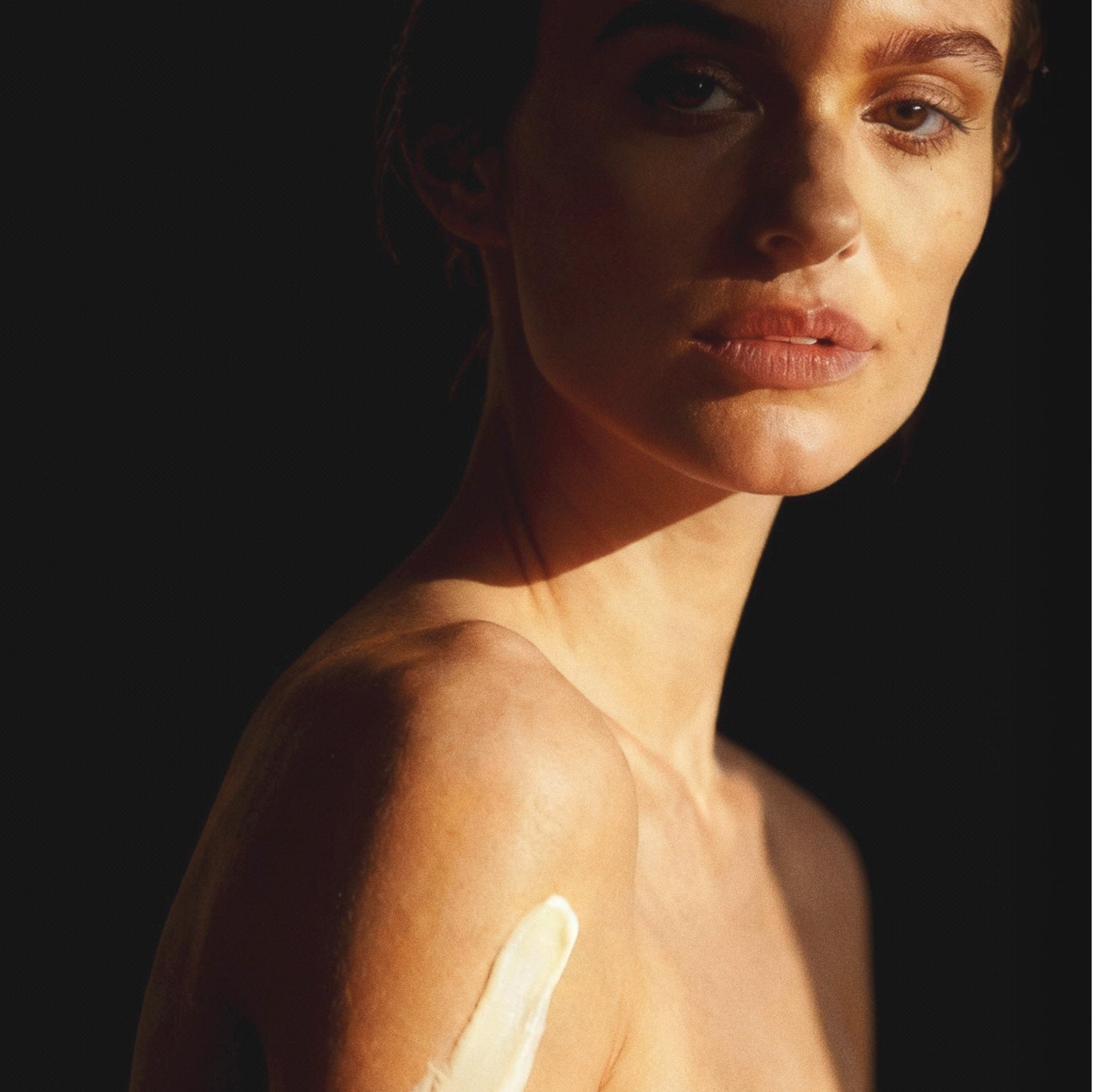 A velvety amber-sandalwood body butter that envelops skin in cozy hydration and soft, lingering glow.