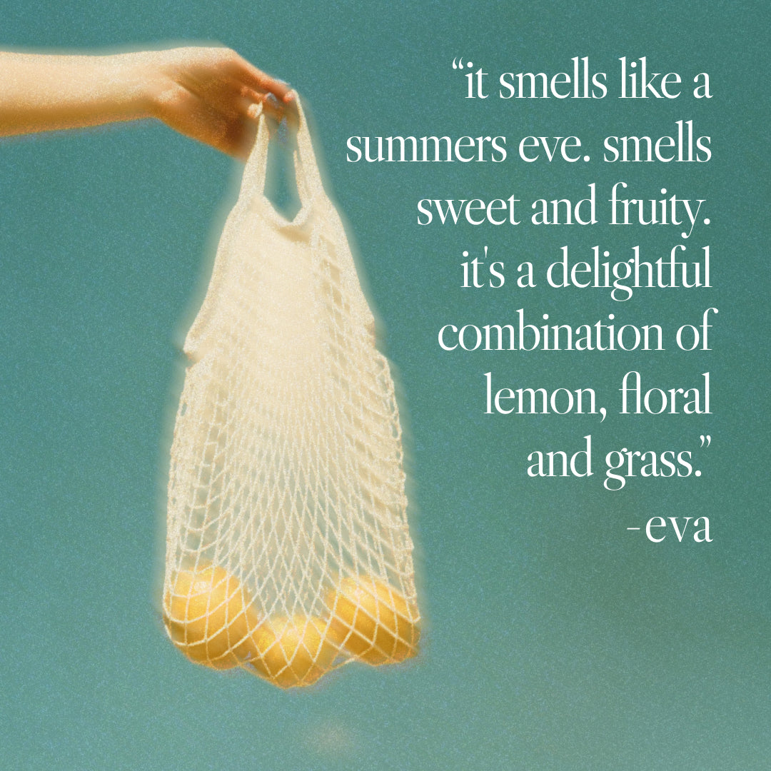 "It smells like a summers eve - sweet and fruity. It's a delightful combination of lemon floral and grass."