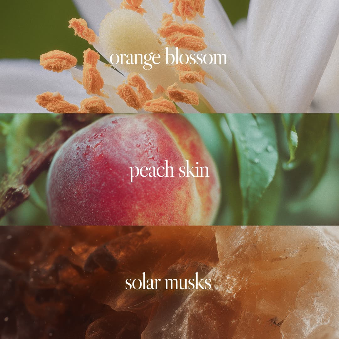 A nostalgic ode to summer—infused with orange blossom, sun-warmed peach skin, and luminous solar musks.